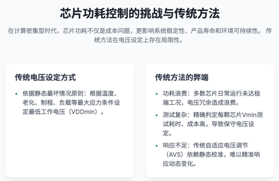 傳統(tǒng)的自適應(yīng)電壓調(diào)節(jié)(AVS)機(jī)制雖能實現(xiàn)一定程度的動態(tài)電壓調(diào)整,但通常依賴靜態(tài)校準(zhǔn)曲線和固定裕度,難以對運行中實際負(fù)載、路徑延遲變化做出精準(zhǔn)響應(yīng)。