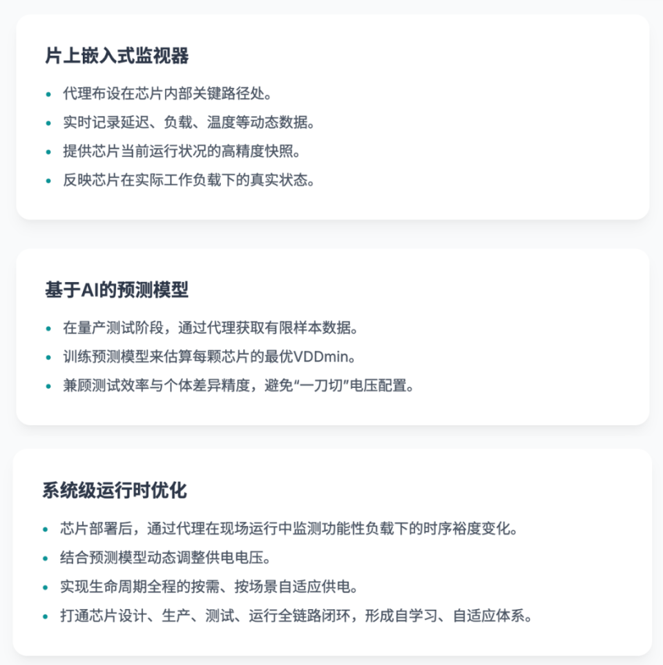 其核心機(jī)制在于:通過嵌入式片上代理(embedded agents)對芯片關(guān)鍵路徑進(jìn)行實時監(jiān)測,結(jié)合機(jī)器學(xué)習(xí)模型預(yù)測每顆芯片、每一運行環(huán)境下的最優(yōu)VDDmin,從而實現(xiàn)更為精細(xì)的動態(tài)供電控制。