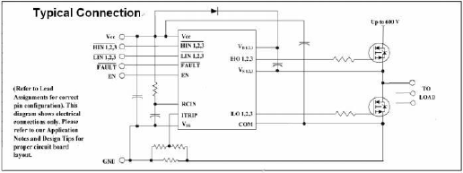 •主要特點:浮動通道設(shè)計用于自啟動操作,完全工作到+ 600v,可承受負瞬態(tài)電壓,柵極驅(qū)動供電范圍從10v到20v,所有通道欠壓鎖定,過流關(guān)斷關(guān)閉所有六個驅(qū)動器,獨立的3個半橋驅(qū)動器,所有通道匹配的傳播延遲,交叉?zhèn)鲗?dǎo)防止邏輯,低側(cè)輸出與輸入失相。3.3 V邏輯兼容,低電壓柵極驅(qū)動,抗噪性更好,外部可編程延遲,故障自動清除,所有部件均無鉛
