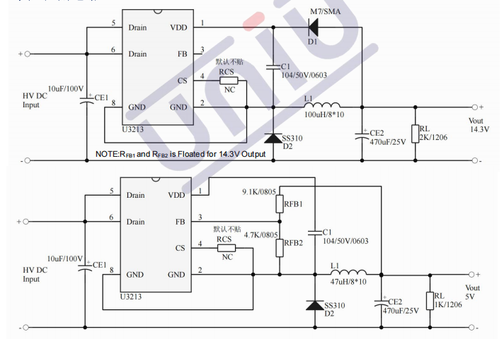 •主要特點:集成 3A 160V MOS ;集成 180V 高壓啟動電路;集成限流電阻(默認1.2A);多模式控制、無異音工作;支持降壓和升降壓拓撲;默認14.3V輸出(FB 腳懸空);待機功耗低于 50mW;良好的線性調整率和負載調整率;集成軟啟動電路;內部保護功能: 過載保護(OLP);逐周期電流限制(OCP);輸出過壓保護(OVP);VDD 過壓、欠壓和電壓箝位保護
